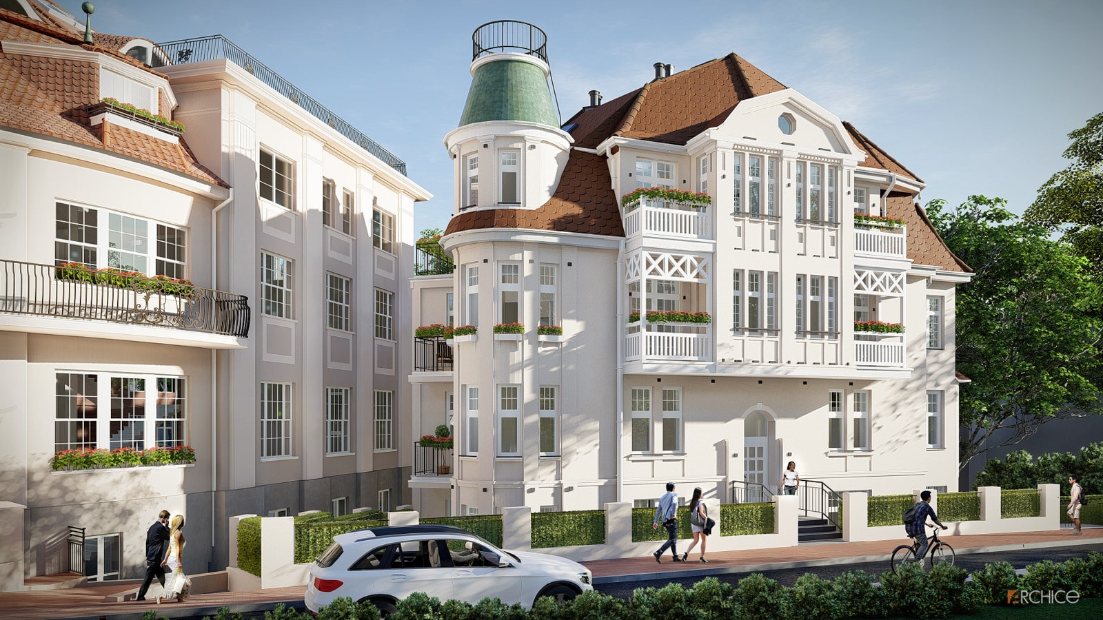 Elewacje budynku zachowały liczne historyczne detale, takie jak bogato zdobione gzymsy, ryzality, pilastry oraz wielospadowy dach mansardowy z lukarnami. Frontowa fasada wyróżnia się wieloma balkonami z balustradami wykonanymi z drewna i metalu oraz eleganckimi wykuszami, które nadają bryle lekkości i finezji. Po stronie północnej znajduje się taras dobudowany w latach 70., pełniący funkcję dodatkowej przestrzeni rekreacyjnej. Całość inwestycji łączy poszanowanie dla historycznego charakteru obiektu z nowoczesnymi standardami życia, harmonijnie wpisując się w prestiżowy nadmorski kontekst Międzyzdrojów. Przebudowa i adaptacja budynku przy ul. Rybackiej 6 zachowuje jego unikalny klimat, jednocześnie gwarantując mieszkańcom komfort i funkcjonalność na najwyższym poziomie.